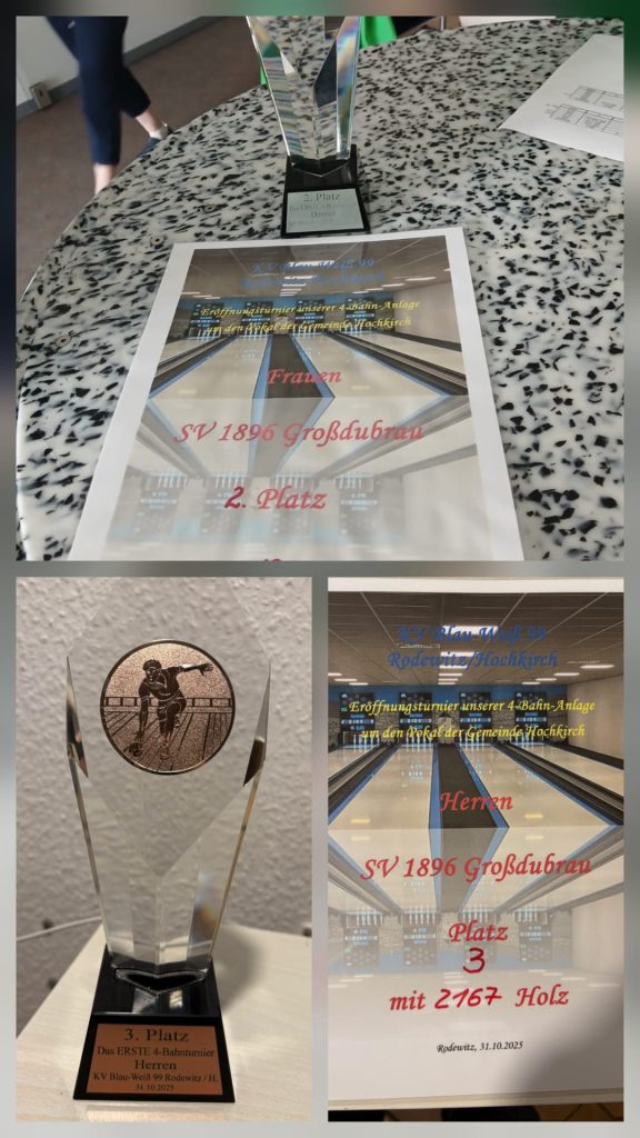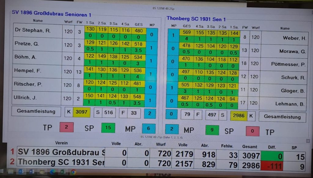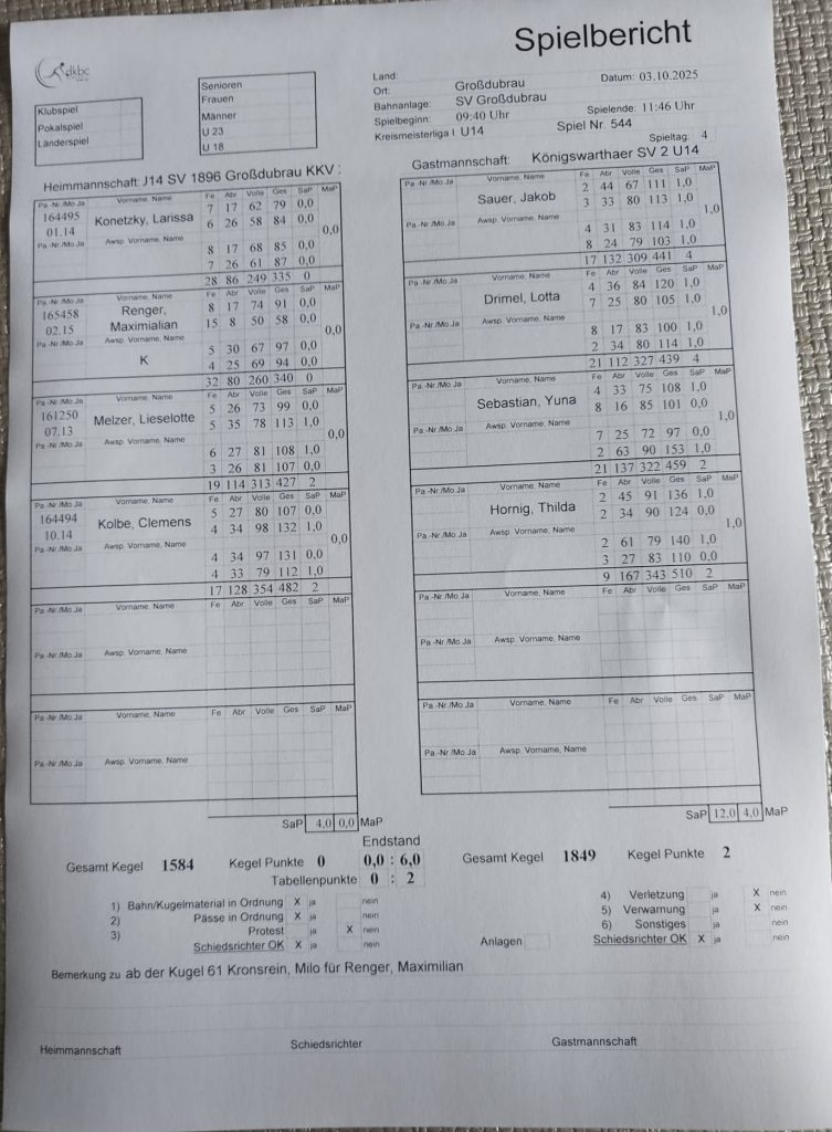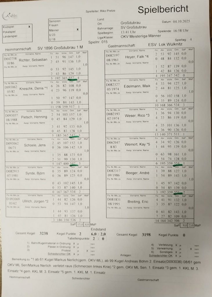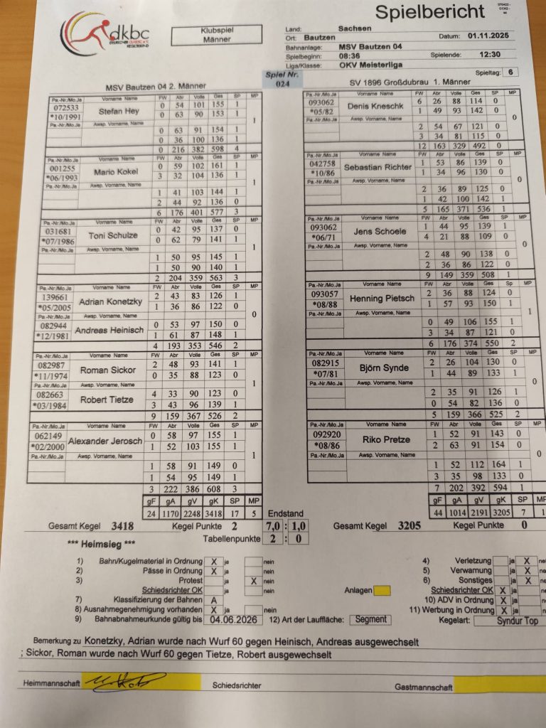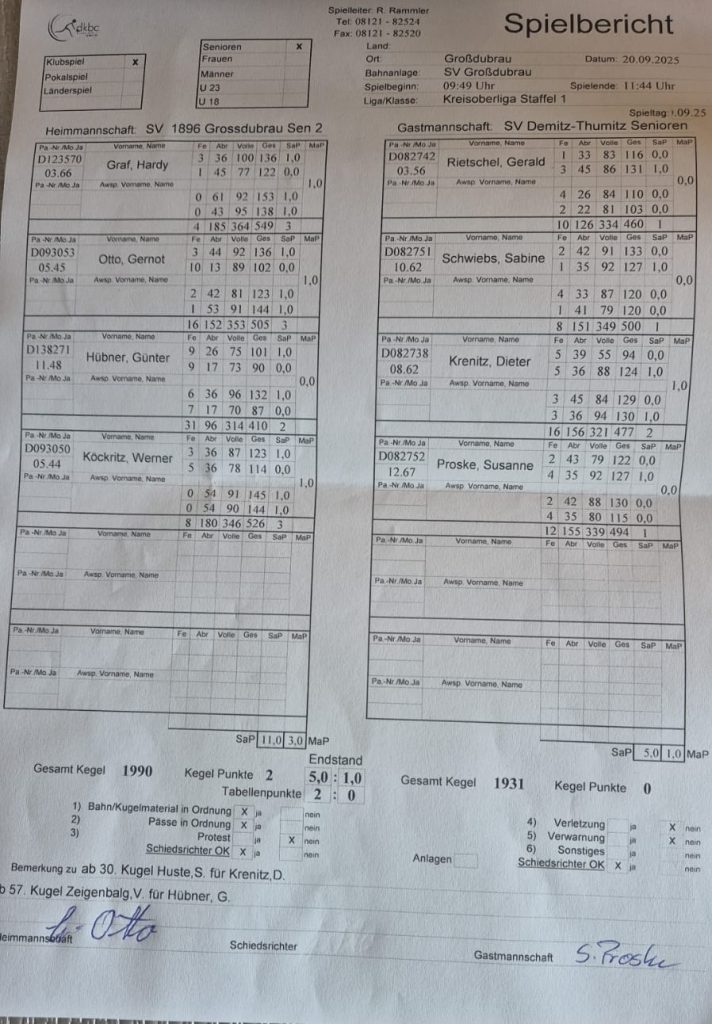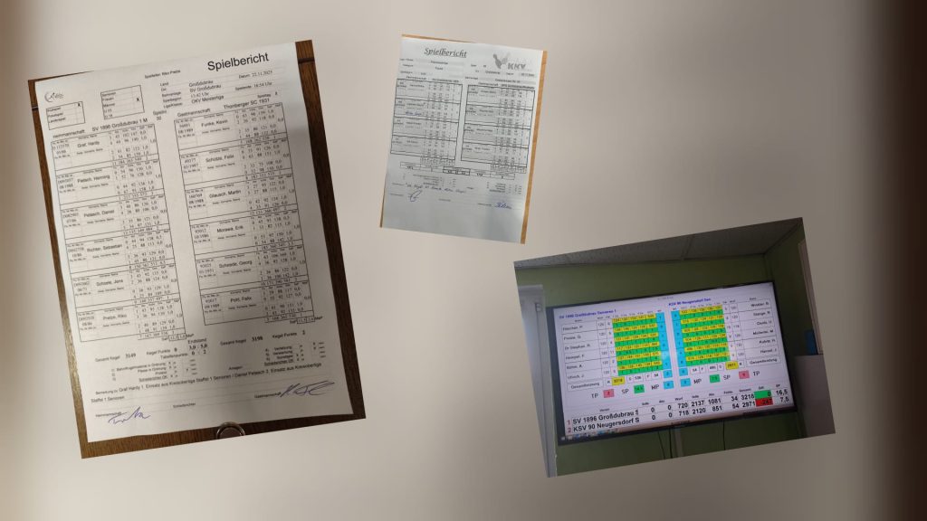 Dieses Wochenende den 22.11.25 wurden die Klubspiele der Frauen, 1.Männer und 1.Snioren ausgetragen. Unserer 1.Senioren und 1.Männer spielten zu Hause. Die erste Senioren spielten gegen KSV 90 Neugersdorf und holten einen Heimsieg mit 3218 Holz und 5 zu 2 Punkte. Leider verlor die 1.Männer gegen Thonberger SC 1931 ihr Spiele knapp mit einer Differenz von 49 Holz. Auch unsere Frauen mussten eine Niederlage auswärts gegen SG Großdrebnitz 1905 hinnehmen.