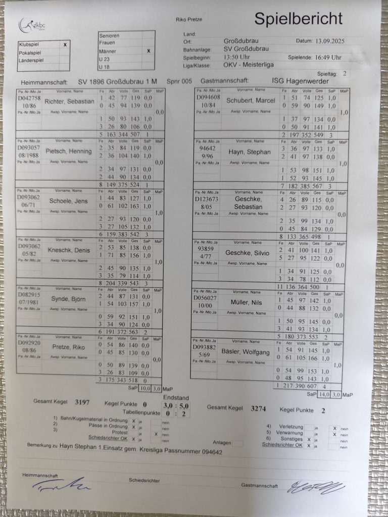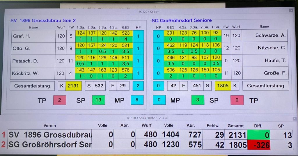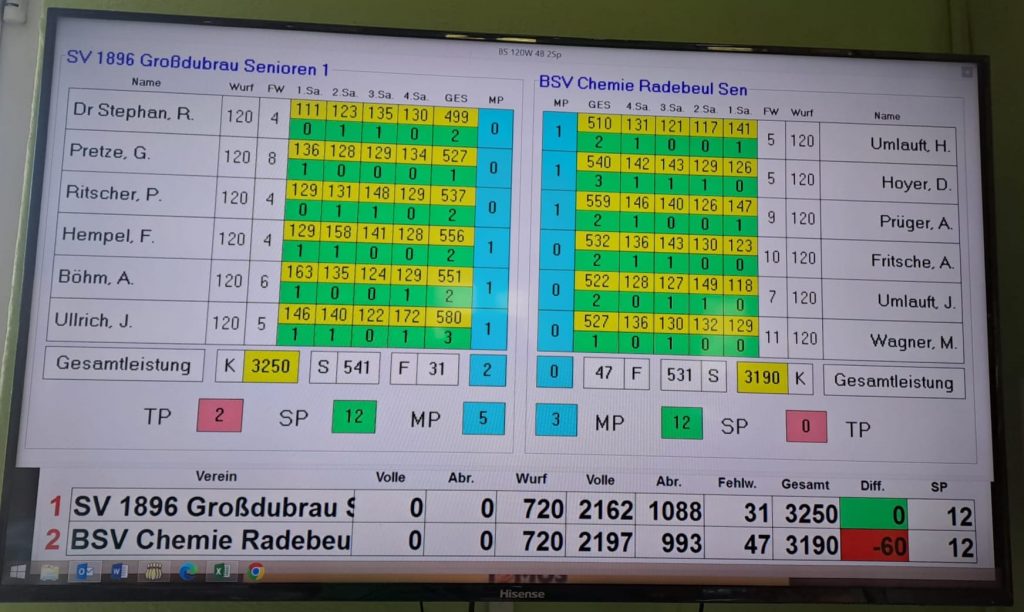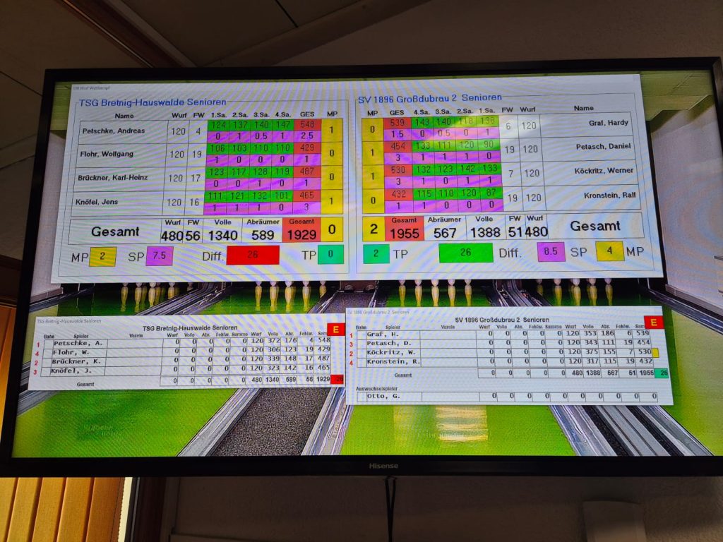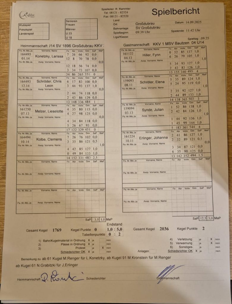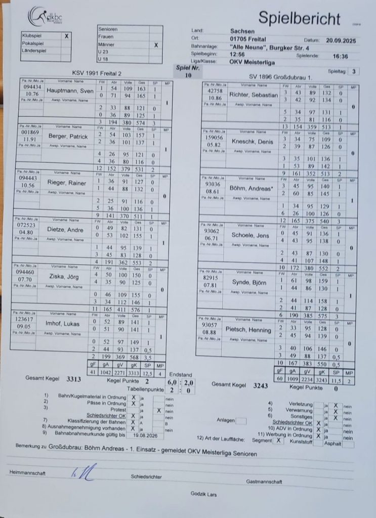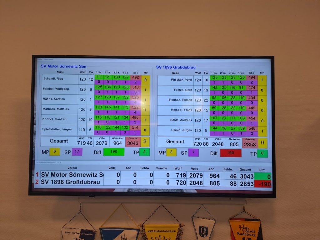Dieses Wochenende den 22.11.25 wurden die Klubspiele der Frauen, 1.Männer und 1.Snioren ausgetragen. Unserer 1.Senioren und 1.Männer spielten zu Hause. Die erste Senioren spielten gegen KSV 90 Neugersdorf und holten einen Heimsieg mit 3218 Holz und 5 zu 2 Punkte. Leider verlor die 1.Männer gegen Thonberger SC 1931 ihr Spiele knapp mit einer Differenz von 49 Holz. Auch unsere Frauen mussten eine Niederlage auswärts gegen SG Großdrebnitz 1905 hinnehmen.