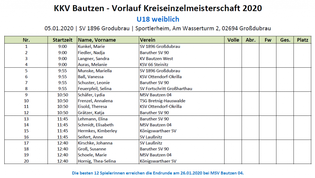 Vorlauf KKV Bautzen Kreiseinzelmeisterschaft 2020 U18 weiblich Veröffentlicht am 11. Dezember 2019 von Lange 05.01.2020 | SV 1896 Grodubrau | Sportlerheim, Am Sportplatz 4, 02694 Großdubrau