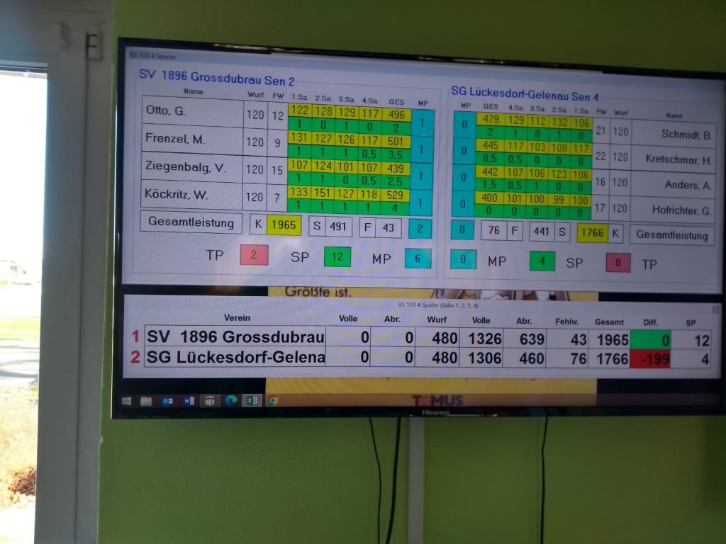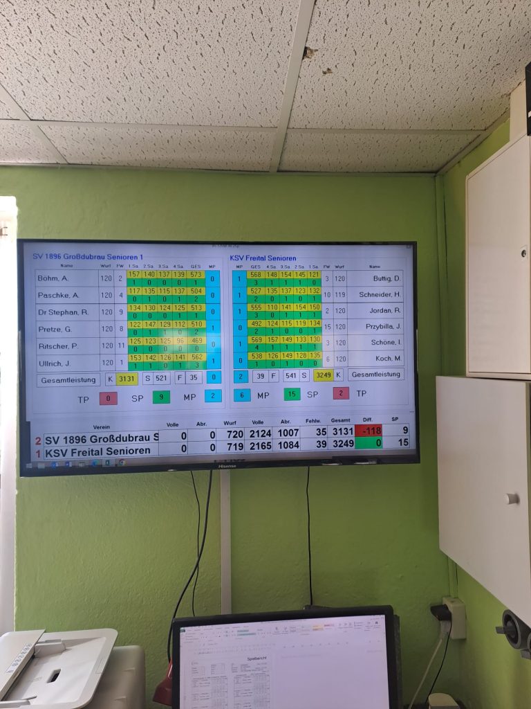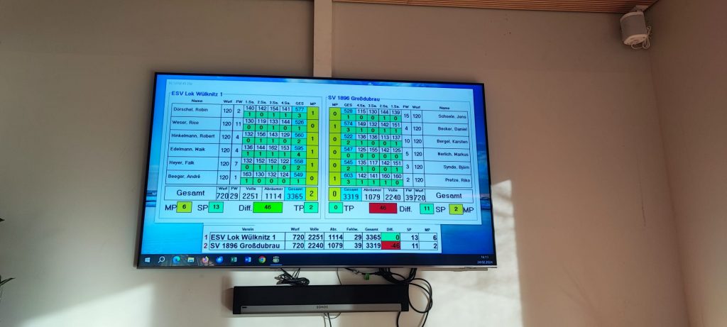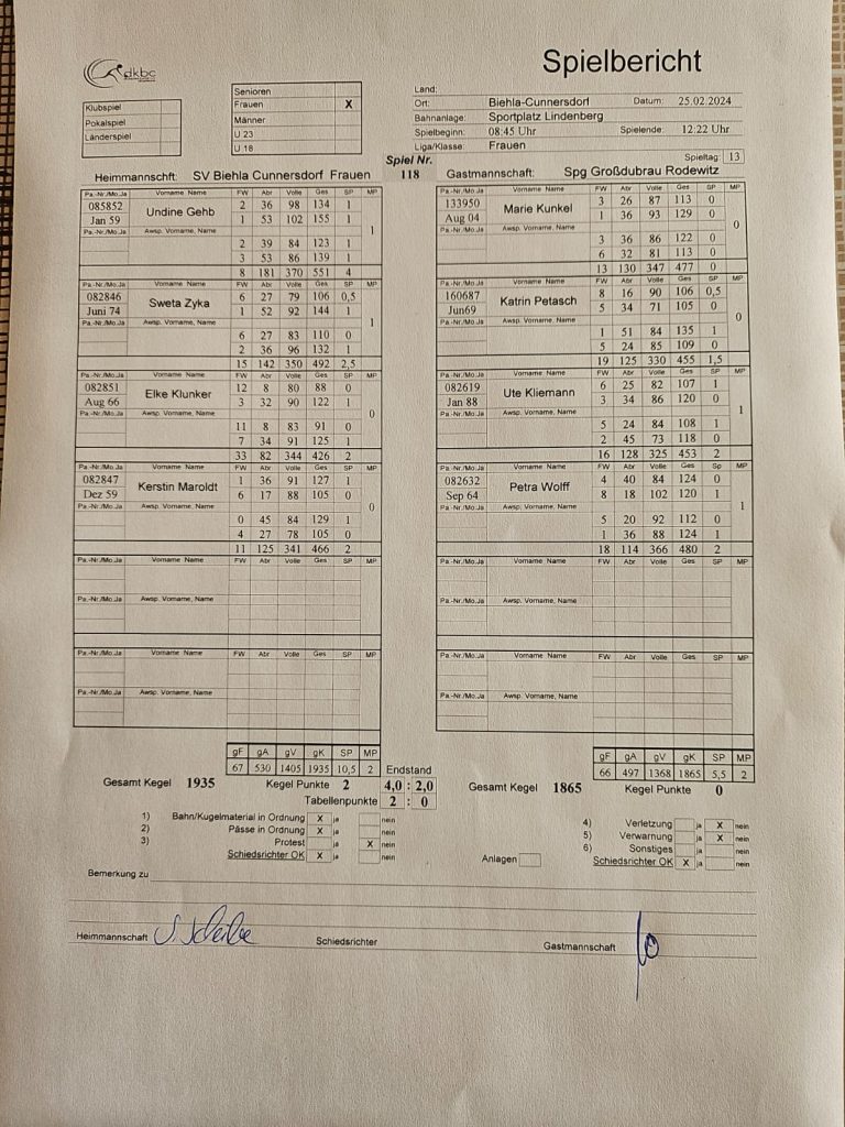 Am Samstag dem 24.02.24 und am Sonntag dem 25.02.24 fanden die Punktspiele im Kegeln der 1.Senioren, der 2.Senioren, der 1.Männer und der Sportgemeinschaft Großdubrau /Rodewitz Frauen statt. Leider hat unsere 1.Senioren mit 3131 Holz gegen KSV Freital Senioren 3249 Holz mit einer Differenz von -118 Holz verloren. Auch unsere 1.Männer mit 3319 Holz mussten gegen die Männer ESV Lok Wülknitz mit 3365 Holz mit einer knappen Differenz von -46 Holz eine Niederlage hinnehmen. Unsere 2.Senioren mit 1965 Holz gegen SG Lückersdorf-Gelenau Senioren 4 mit 1766 Holz holten den Sieg mit einer Differenz von +199 Holz. Am Sonntag dem 25.02.24 spielten unsere Frauen mit 1865 Holz gegen SV Biehla Cunnersdorf Frauen mit 1935 Holz. Mit einer Differenz von -70 Holz mussten auch sie eine Niederlage hinnehmen.