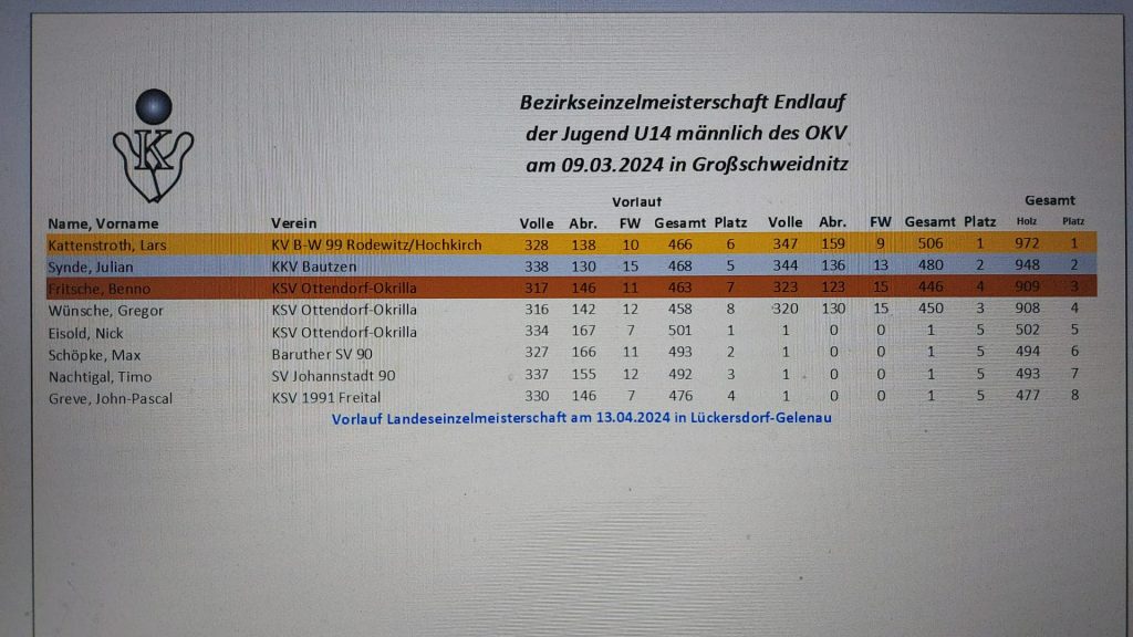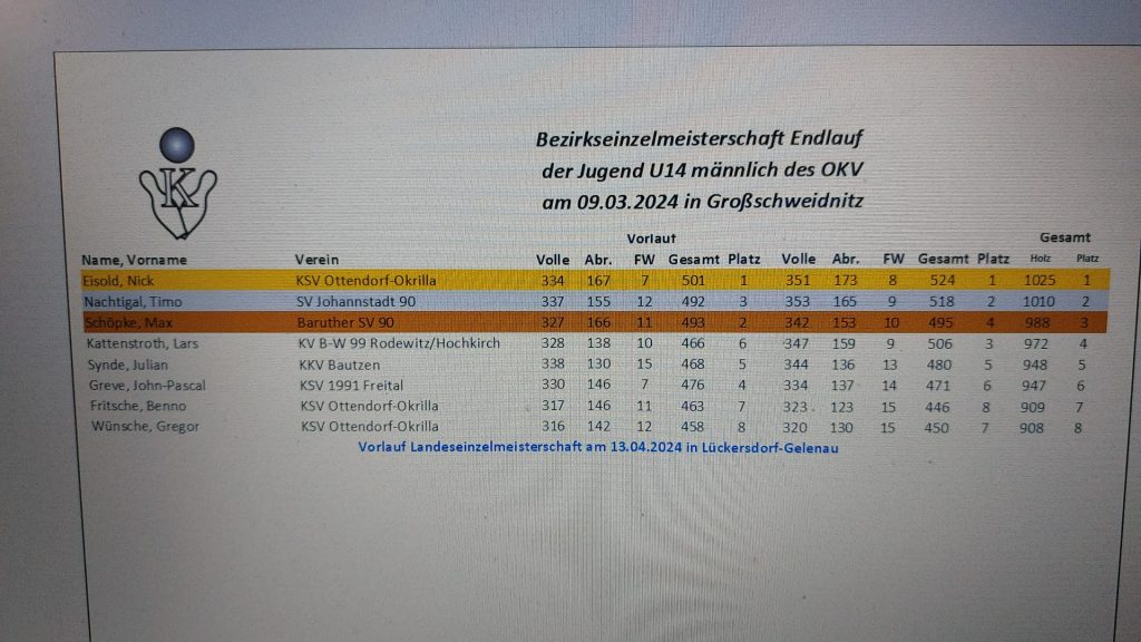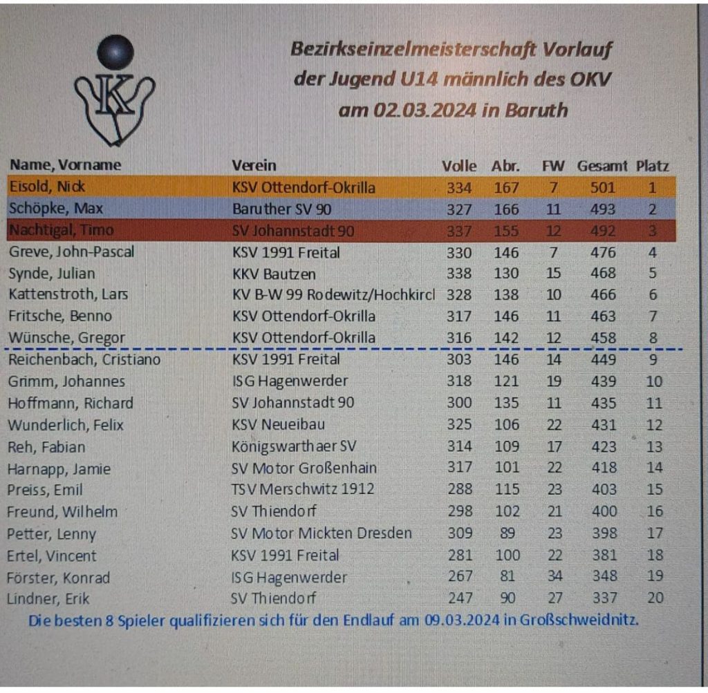 Am 02.03.24 fand die Bezirkseinzelmeisterschaft der Jugend U14 männlich auf der Kegelbahn in Baruth statt. Unser jüngster Kegelfreund Julian Synde U14 nahm an der Bezirkseinzelmeisterschaft Vorlauf teil. Er belegte den 5.Platz so das er in den Endlauf kam. Heute am 09.03.24 fand der Endlauf statt. Auch dieses mal hat der Kegelfreund Julian Synde den 5.Platz belegt, so das er sich für die Landeseinzelmeisterschaft Vorlauf am 13.04.24 in Lückersdorf-Gelenau qualifiziert hat. Wir gratulieren zu diesem Erfolg.