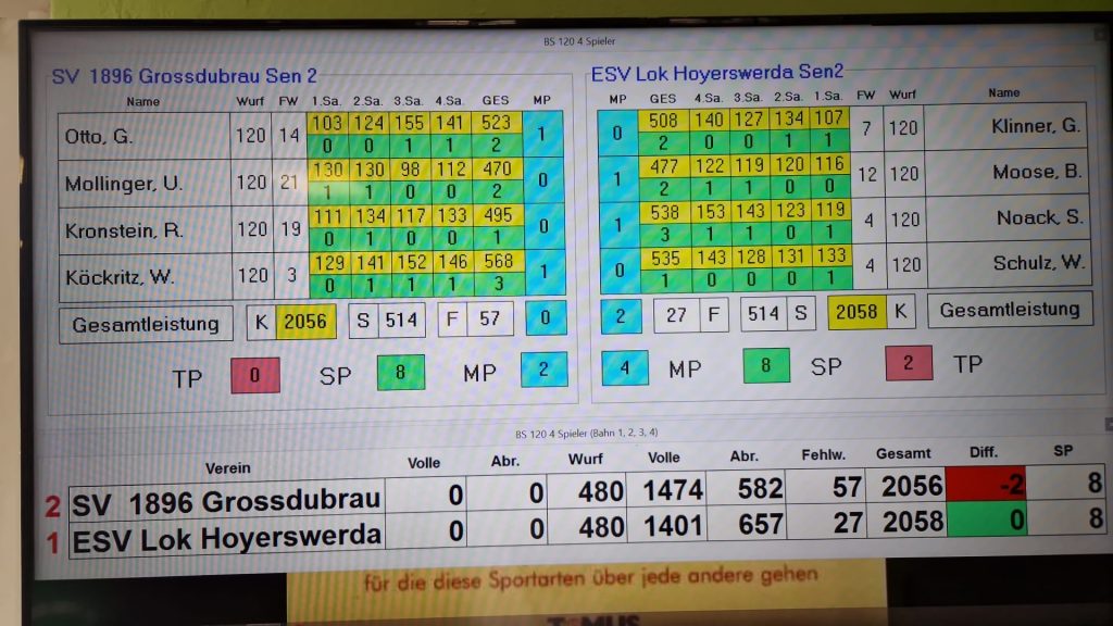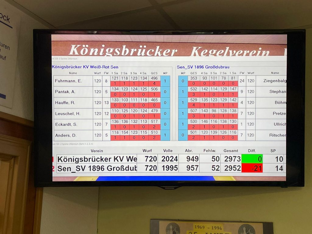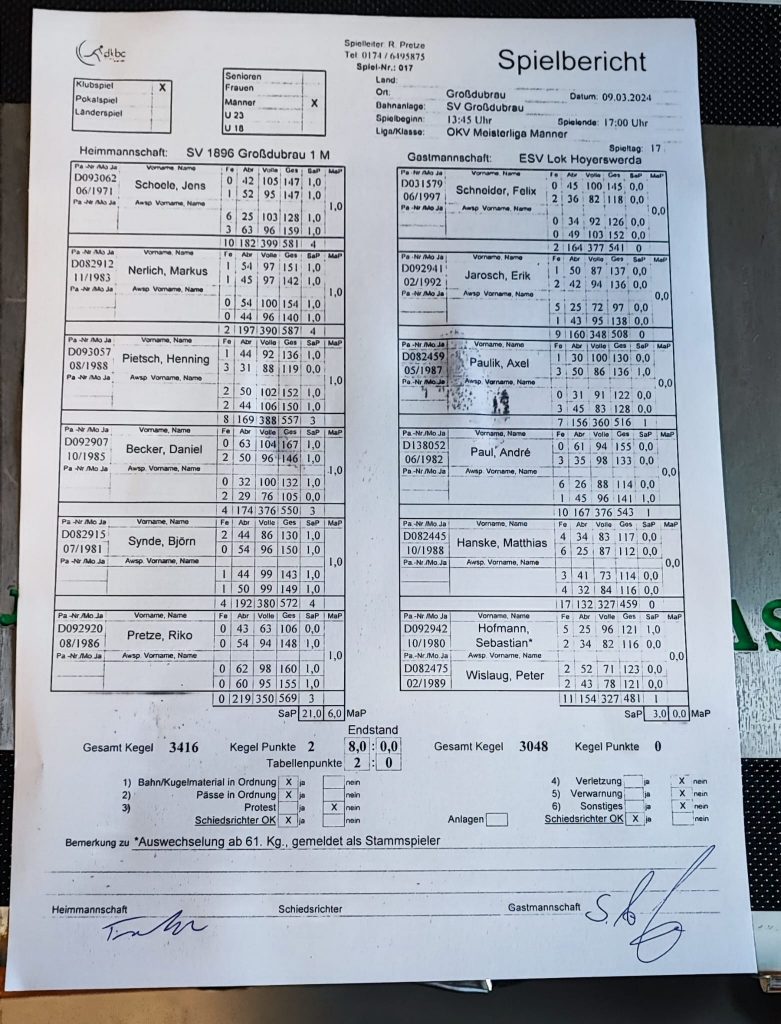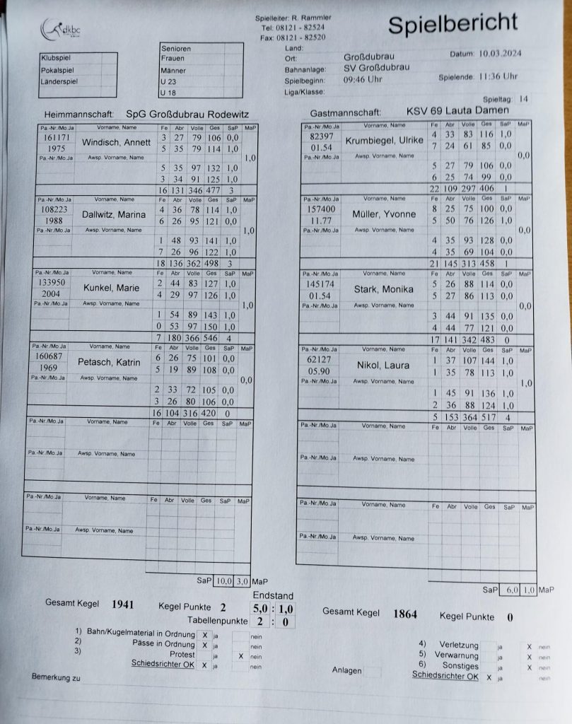 Am Samstag den 09.03.24 spielten unsere 1. 2.Senioren und die1.Männermanschaft. Bei diesem Punktspiel hat unsere 1.Senioren ein unentschieden gegen Königsbrücker KV Weiß-Rot Senioren erzielt. Leider hat die 2.Senioren gegen ESV Lok Hoyerswerda eine Niederlage einstecken müssen mit einer Differenz von 2 Holz. Die 1.Männermannschaft spielte gegen ESV Lok Hoyerswerda. Sie erreichten einen klaren Sieg zu Hause. Unsere Frauen der SpG Großdubrau/Rodewitz erreichten an diesem Sonntag einen Sieg gegen KSV 69 Lauta Damen. Wir gratulieren zu den Ergebnissen.