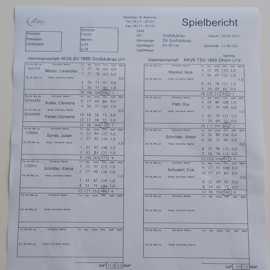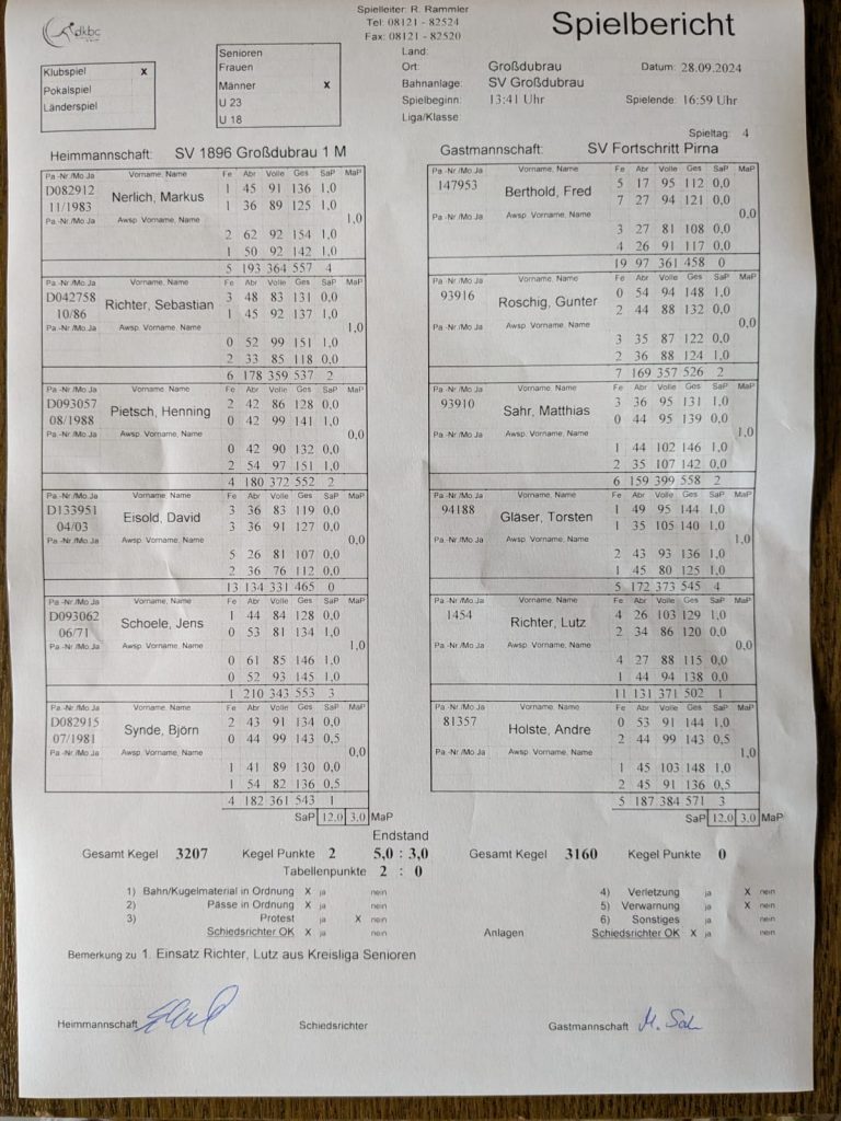 Am Samstag dem 28.09.24 holte unsere 1.Männermannschaft gegen SV Fortschritt Pirna einen Heimsieg mit 3207 Holz mit einer Differenz von 47 Holz. Der beste Kegler von unserer 1. Männermannschaft ist der Sportfreund Markus Nerlich mit 557 Holz. Bei der Mannschaft aus Pirna ist der beste Kegler der Sportfreund Andre Holste mit 571 Holz. Auch unsere U14 spielte am Sonntag dem 29.09.24 zu Hause gegen die TSV 1865 Ohorn U14 wo unsere Mannschaft einen Heimsieg mit 1745 Holz erzielte. Die Differenz zwischen den beiden Mannschaften betrug 105 Holz. Der Kegelfreund Julian Synde ist der Beste in der Kategorie der U14 mit 521 Holz und aus Ohorn Nick Wenkel mit 446 Holz.