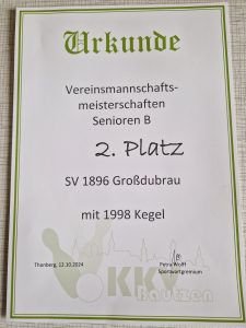 Am Samstag den 12.Oktober 2024 fanden in Thonberg auf der Kegelbahn die Vereinsmeisterschaften Senioren B statt. Folgende Vereine nahmen teil: Mannschaft 1 TSG Bernsdorf, Mannschaft 2 SV 1896 Großdubrau und Mannschaft 3 SG Lückersdorf-Gelenau. Die Mannschaft TSG Bernsdorf belegte den 1.Platz mit 2049 Holz unsere 1.Senioren SV1896 Großdubrau den 2. Platz mit 1998 Holz. Den 3.Platz holte sich die Mannschaft SG Lückersdorf-Gelenau mit 1702 Holz. Wir gratulieren zu diesen Ergebnissen