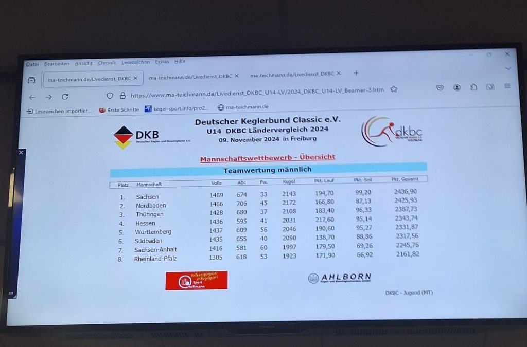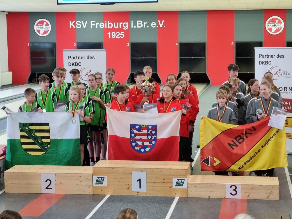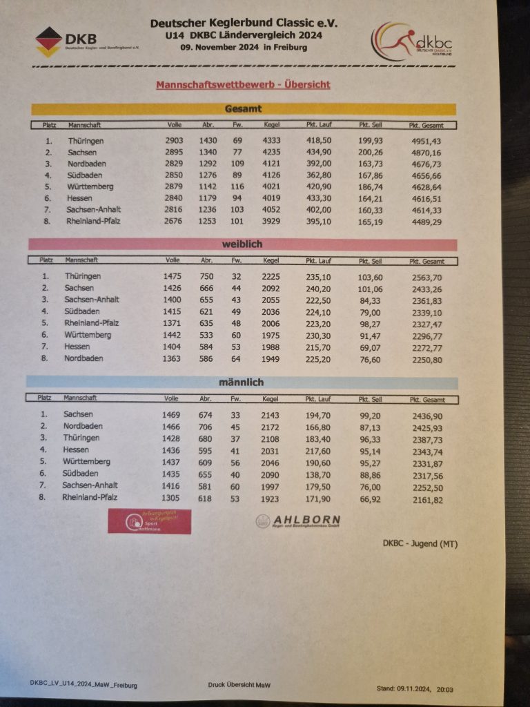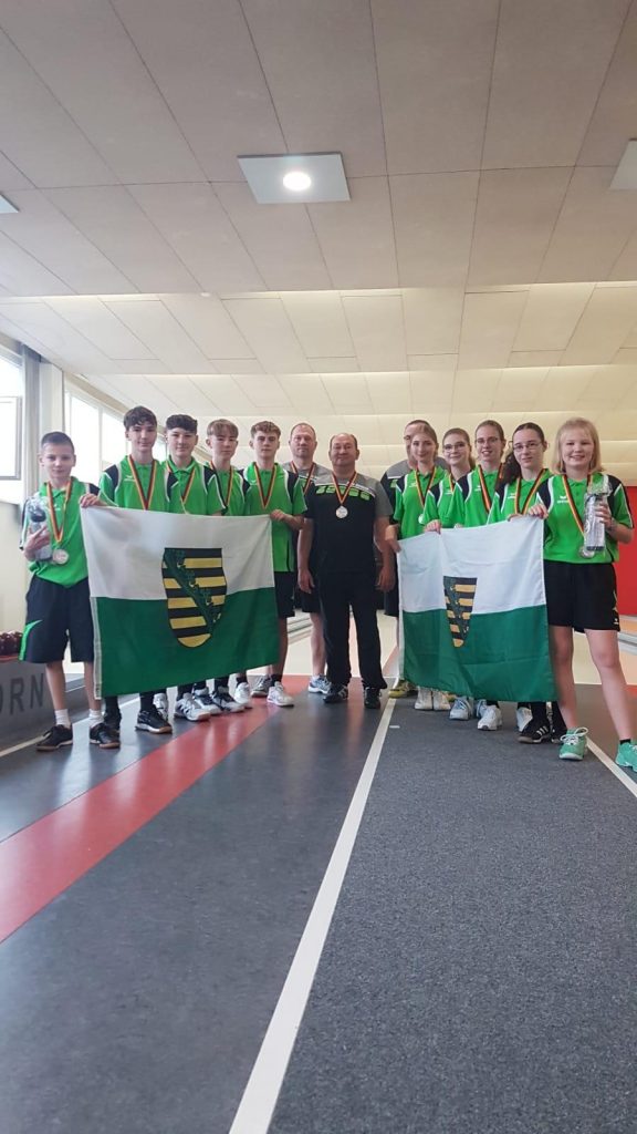 Am Samstag den 09.11.24 nahmen 8 Bundesländer bei diesem Ländervergleich teil. Dort haben sich 5 Jungen und 5 Mädchen vom Land Sachsen qualifiziert. Einer war der Sportfreund Julian Synde aus unserem Kegelverein. Bei der Teamwertung männlich spielte Julian 493 Holz, so das er mit den anderen Kegelfreunden aus Sachsen den 1.Platz mit 2436 Punkte im Ländervergleich holte. Das beinhaltet Kegeln, Lauf und Seilspringen. Die Mädchen belegten bei der Teamwertung den 2.Platz mit 2433,26 Punkte. In der Gesamtwertung belegten die Mädchen und Jungen von Sachsen den 2. Platz. Wir gratulieren zu diesem Erfolg, macht weiter so.