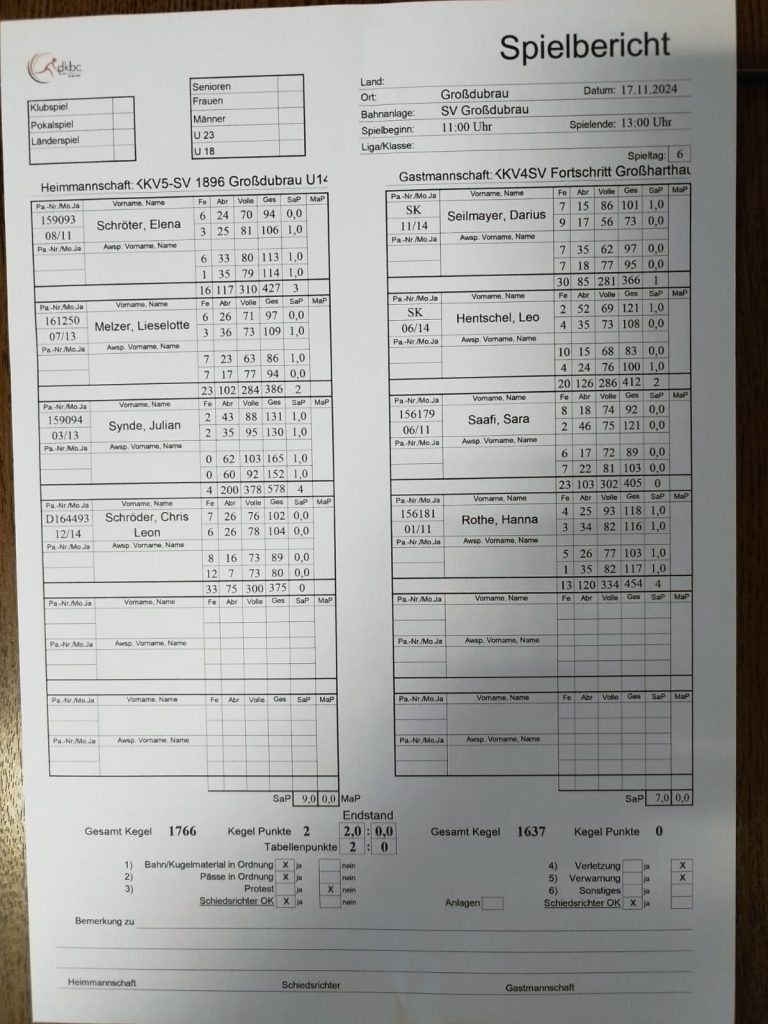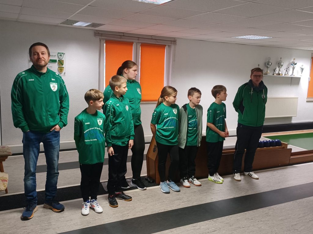 Am Sonntag den 17.11.24 spielte unsere Nachwuchsmannschaft U14 zu Hause gegen KV4 SV Fortschritt Großharthau. Unsere U14 holte einen Sieg mit 1766 Holz gegenüber der Gastmannschaft mit nur 1637 Holz. Von unserer Mannschaft erzielte Julian Synde 578 Holz. Hanna Rothe war die Beste von Großharthau mit 454 Holz. Wir gratulieren.