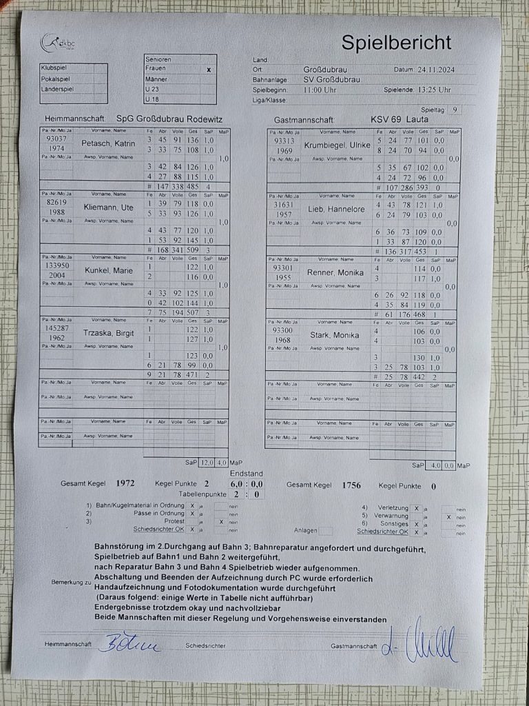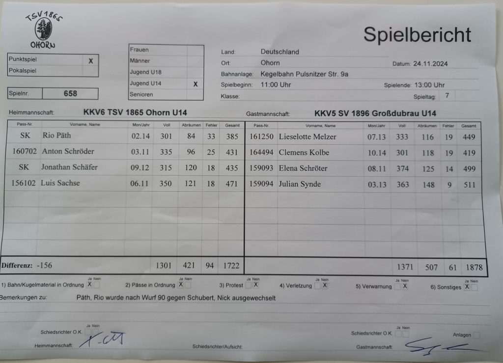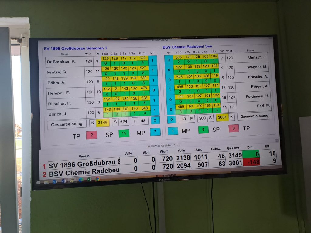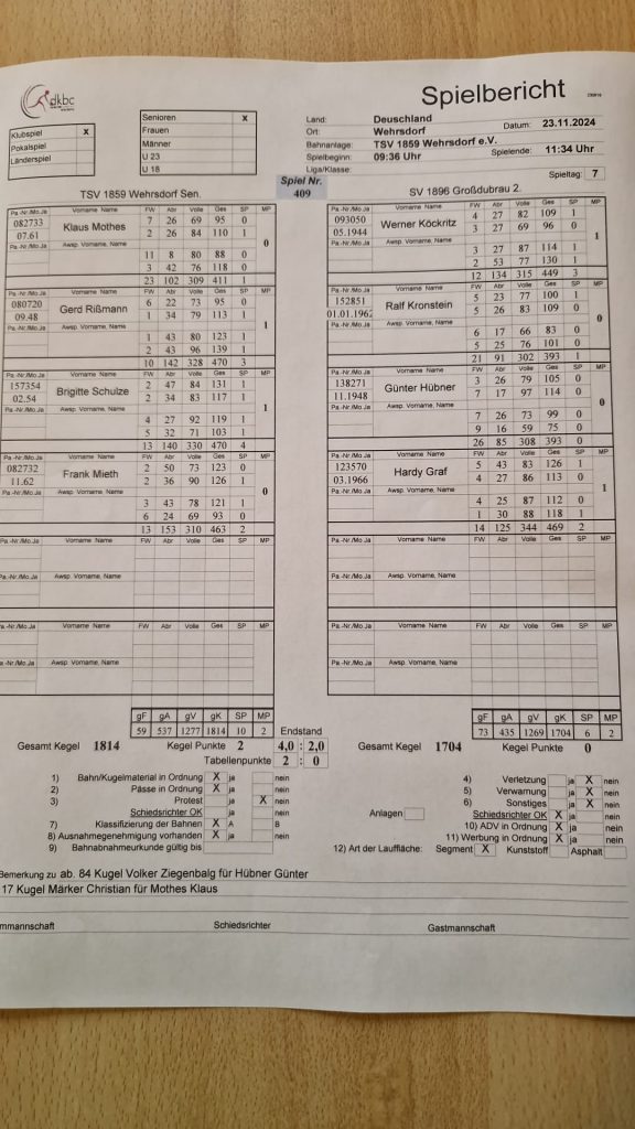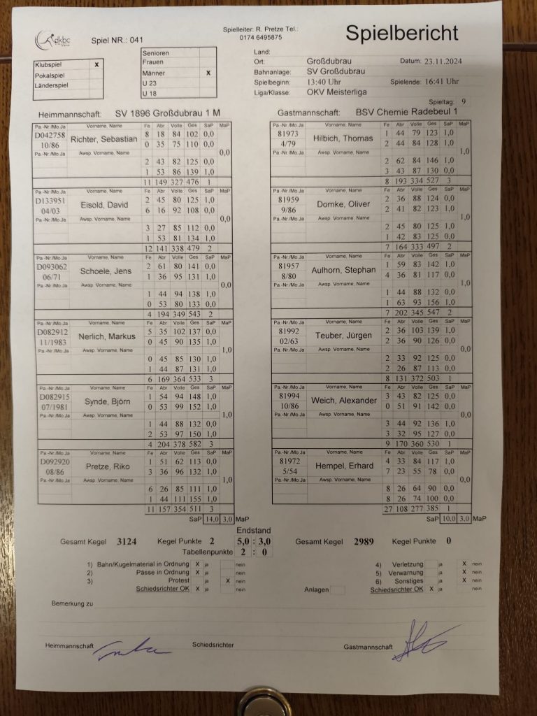 Am Samstag den 23.11.24 spielten unsere 1.Männer,1.Senioren und die 2.Senioren. Die 1.Männer und die 1.Senioren holten jeweils zu Hause einen Sieg. Unsere 1.Männer spielten gegen BSV Chemie Radebeul 1 und erzielten mit 3124 Holz, die Gastmannschaft erzielte 2989 Holz, so das die 1.Männer einen klaren Sieg holten. Auch die 1.Senioren spielten gegen BSV Radebeul Sen. einen Sieg mit 3149 Holz gegenüber von 3001 Holz hinnehmen mussten. Leider musste die 2.Senioren auswärts eine Niederlage mit 1704 Holz, so das die Gastmannschaft TSV 1859 Wehrsdorf Sen. siegte mit 1814 Holz. Auch unsere Kids U14 holten einen Sieg am Sonntag den 24.11.24 mit mit 1878 Holz gegen KKV6 TSV 1865 Ohorn U14. Sie erzielten 1722 Holz. Es muss den Kids ein großes Lob für die gute Leistung ausgesprochen werden, macht weiter so. Bei den SpG Frauen gab es Probleme mit der Kegelbahn, aber sie haben es gut gemeistert, da das Spiel gegen KSV 69 Lauta weiter fort gesetzt wurde. Auch unsere Frauen konnten einen klaren Sieg mit 1972 Holz gegen Lauta mit1756 Holz mit nehmen. Wir gratulieren zu diesem Erfolg.