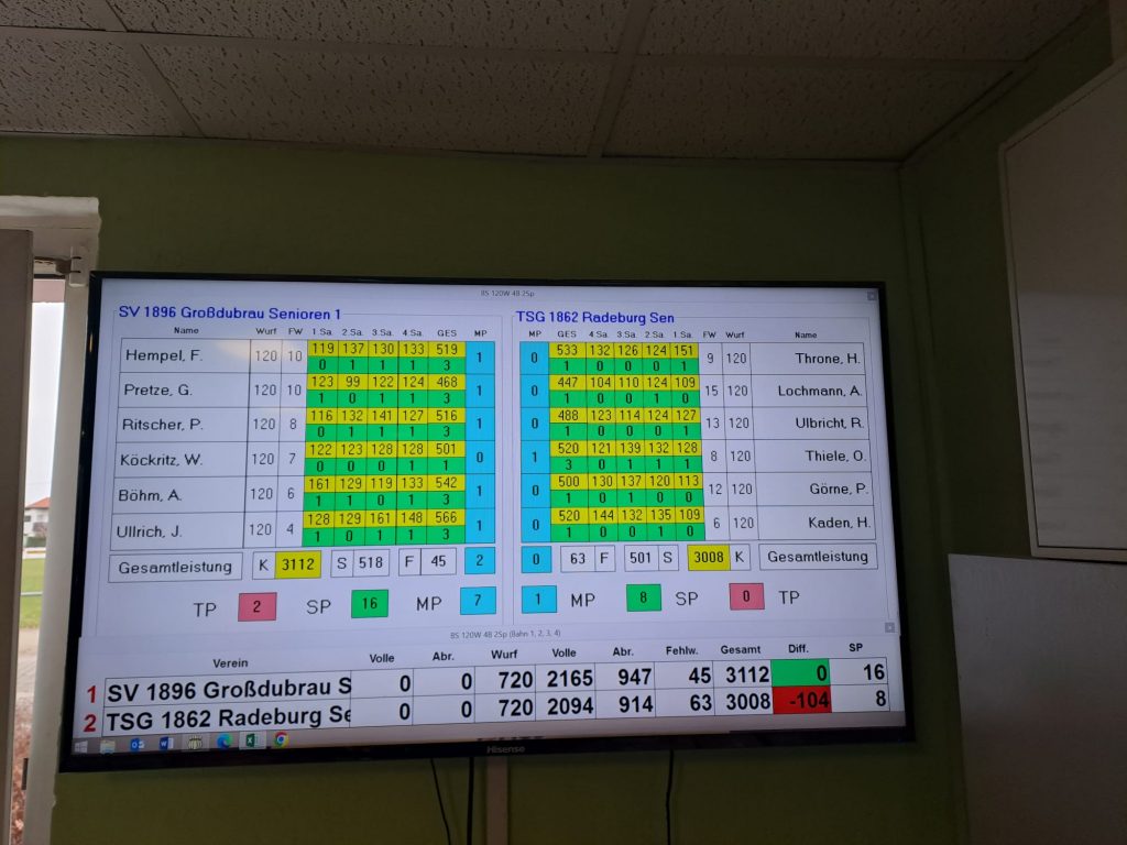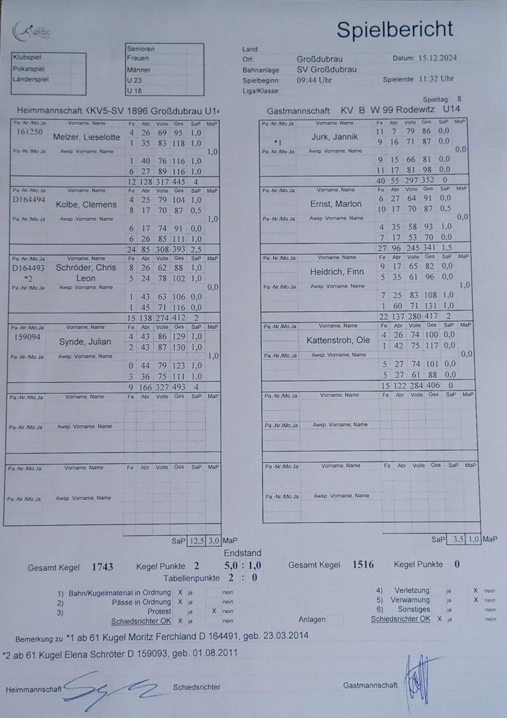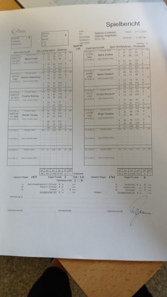 Am Samstag den 14.12.24 und 15.12.24 holten die 1.Senioren, 1.Männermannschaft und die U14 jeweils einen Sieg. Die SpG Frauen mussten eine Niederlage bei SG Lückersdorf-Gelenau mit 1761 Holz und 1,0 MP hinnehmen, so das sich die Gastmannschaft mit 1937 Holz 5,0 MP holte. Unsere 1.Senioren spielten zu Hause gegen TSG 1862 Radeburg Sen. wo sie 3112 Holz und 7,0 MP erzielten und die Gastmannschaft 3008 Holz und 1,0 MP . Die 1.Männermannschaft spielte bei TSV 1865 Ohorn M. Dort konnten unsere Kegler einen Sieg mit 3312 Holz und 3,0 MP erlangen. Die Gastmannschaft erzielte 3295 Holz und 3,0 MP. Auch unsere Kids haben einen Sieg gegen KV B-W Rodewitz mit 1743 Holz und 5,0 MP zu verzeichnen. U14 KV Blau-Weiß Rodewitz erreichten mit 1516 Holz 1,0 MP.