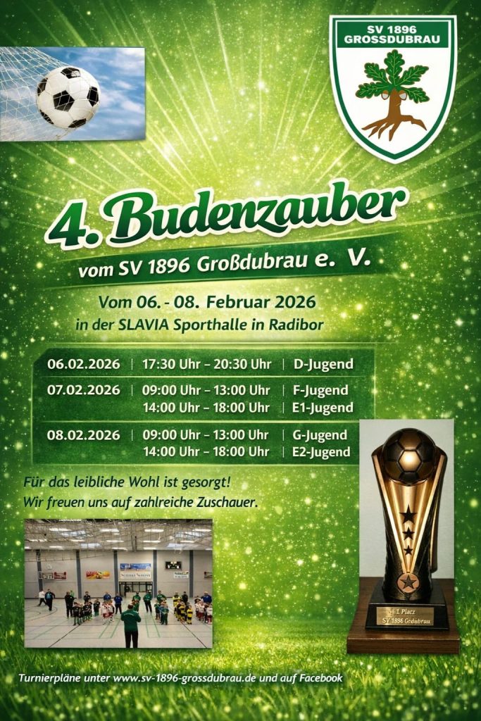 Großdubrauer Budenzauber F-Junioren 2026 💚🤍https://www.meinturnierplan.de/showit.php?id=0lkpzklx4uDatum und Zeit: Samstag, 7. Februar 2026 um 09:00 – 13:01Veranstaltungsort: Sport- und Mehrzweckhalle „SLAVIA“ Radibor, Dr.-Maria-Grollmuß-Straße 5, 02627 Radibor, DeutschlandVeranstalter: SV 1896 Großdubrau, https://www.sv-1896-grossdubrau.de/Sponsor: Green Energy Bautzen, https://greenenergy-bautzen.de/4.