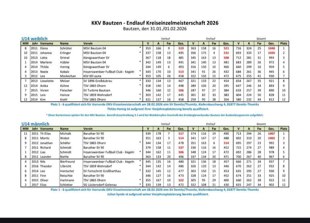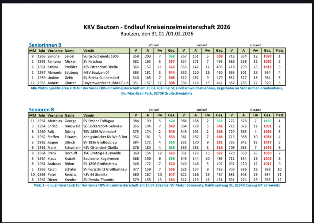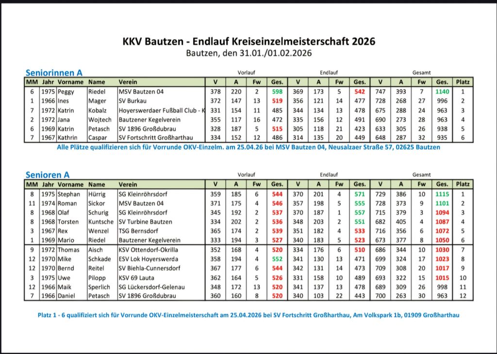 Am Samstag den 31.01.26 und Sonntag den 01.02.26 wurde die Endrunde der Kreiseinzelmeisterschaften im Kegelheim Bautzen ausgetragen. Folgende Kegelfreunde und Kegelfreudinnen haben sich für die Endrunde qualifiziert: Liesalotte Melzer U14, Marie Kunkel Juniorinnen U23, Katrin Petasch Seniorinnen A, Daniel Petasch Senioren A, Jürgen Ulrich und Andreas Böhm Senioren B und Peter Ritscher Senioren C. Kegelfreund Peter Ritscher wurde Kreismeister Senioren C mit Gesamtwertung von 1125 Holz und konnte einen Einzelbahnrekord mit 575 Holz auf der Kegelbahn in Kegelheim Bautzen holen. Bei den Seniorinnen A belegte Katrin Petasch mit der Gesamtwertung von 938 Holz den 5. Platz und Marie Kunkel mit Gesamtwertung von 964 Holz in ihrer Alterklasse Juniorinnen U23 den 4. Platz. Auch am Sonntag den 01.02.26 wurde die Kreiseinzelmeisterschaften fortgesetzt. Liesalotte Melzer konnte mit Gesamtwertung von 921 Holz den 8. Platz belegen in der Alterklasse U14. Daniel Petasch Senioren A holte in der Gesamtwertung mit 963 Holz den 12. Platz. Jürgen Ulrich Senioren B konnte mit der Gesamtwertung von 1077 Holz den 5 Platz holen und Andreas Böhm den 9. Platz mit der Gesamtwertung von 1017 Holz. Die Kegelfreundinnen und Kegelfreunde Marie Kunkel, Katrin Petasch, Peter Ritscher und Jürgen Ulrich haben sich für die Vorrunde OKV Bezirksmeisterschaften am 25.04.26 qualifiziert. Wir der SV 1896 Großdubrau gratulieren zu diesen Ergebnissen.
