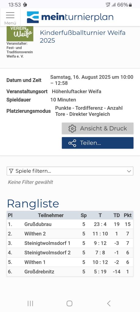 Starke Leistung zeigte unserer E-Jugend💪 Heute haben sie ungeschlagen den ersten Tabellenplatz beim Kinderfußballturnier in Weifa erkämpft. Mit der Goldmedaille im Gepäck ging es glücklich nach Hause. Herzlichen Glückwunsch!